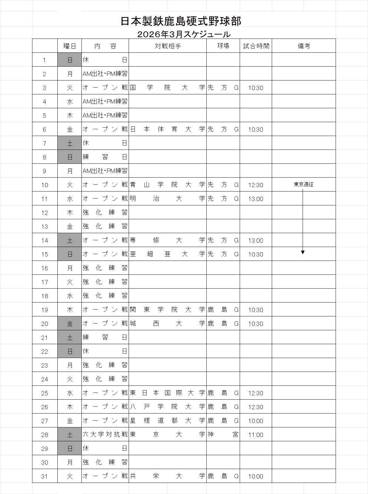 【オープン戦】対 東京ガス(6/10・試合時間変更)