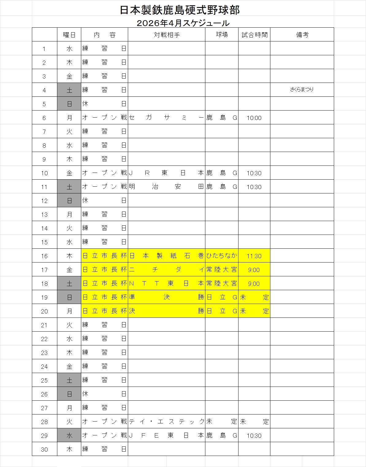 2026年4月度 スケジュール
